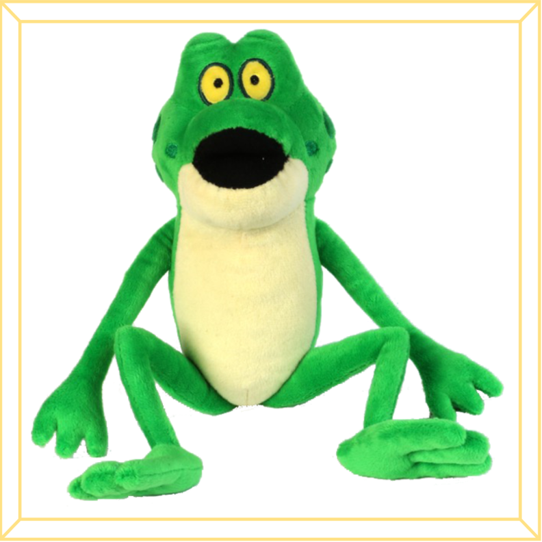 The surprised JeanBob plush toy is 7" inches tall with embroidered eyes. Designed to resemble JeanBob, the frog character from the animated film series, The Swan Princess. This is a high-quality plush toy made by Oriland International.